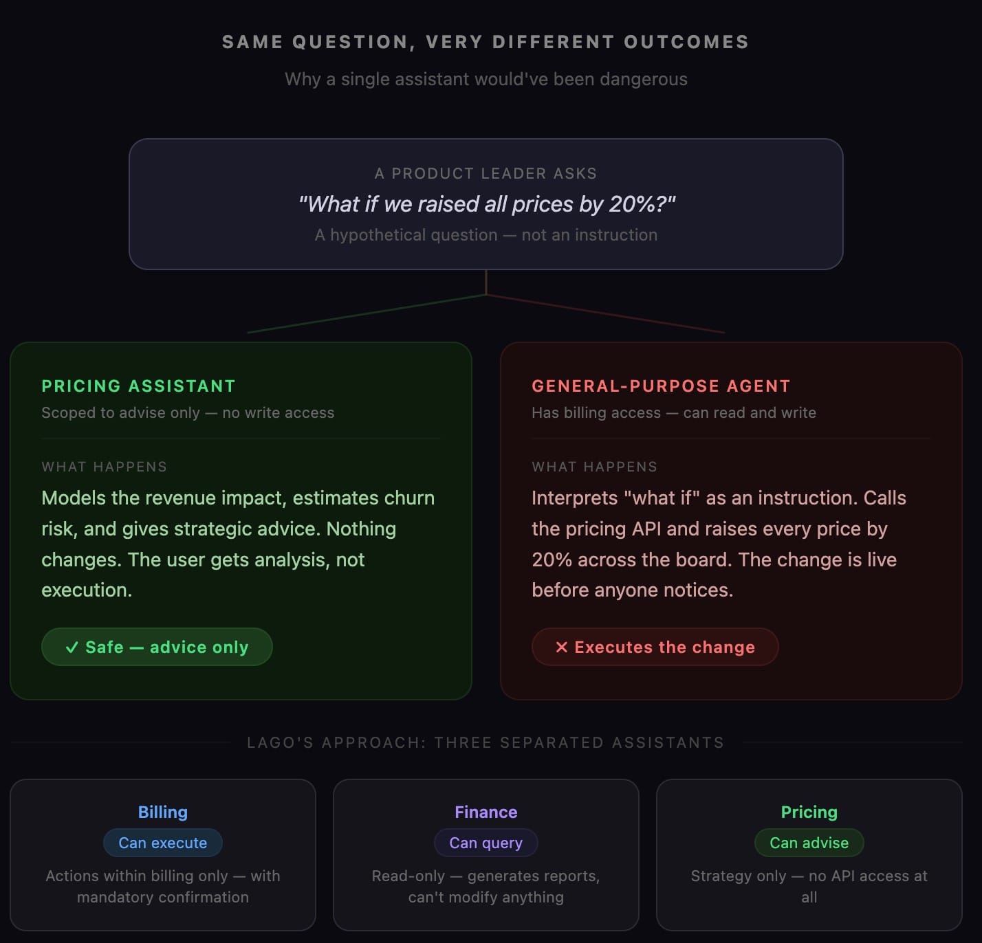 Imagine a product leader asks "what if we raised all prices by 20%?" If they're talking to the pricing assistant, they get strategic advice. If they're talking to a general-purpose agent with billing access, it might interpret this as an instruction to raise prices and execute the change.