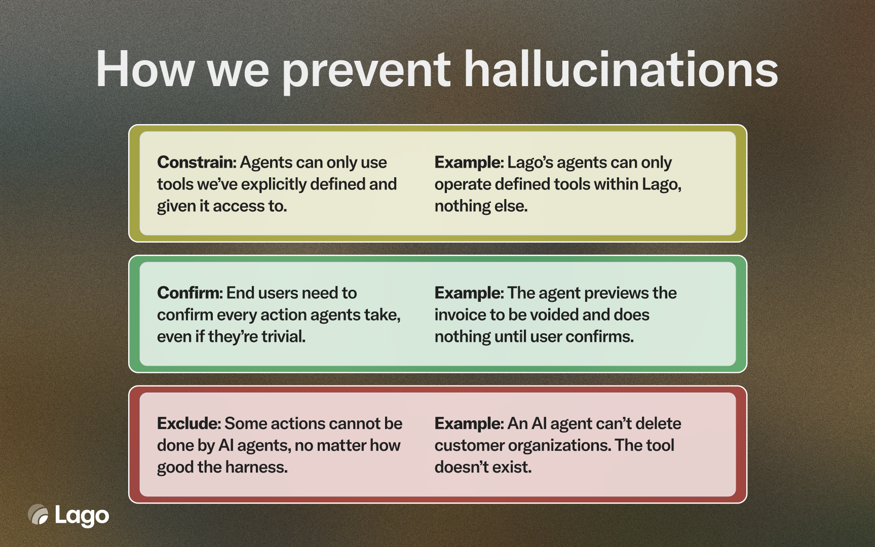 That's why we treat hallucination prevention as a system, not a prompt trick. Our approach has three layers: Constrain, Confirm, Exclude.