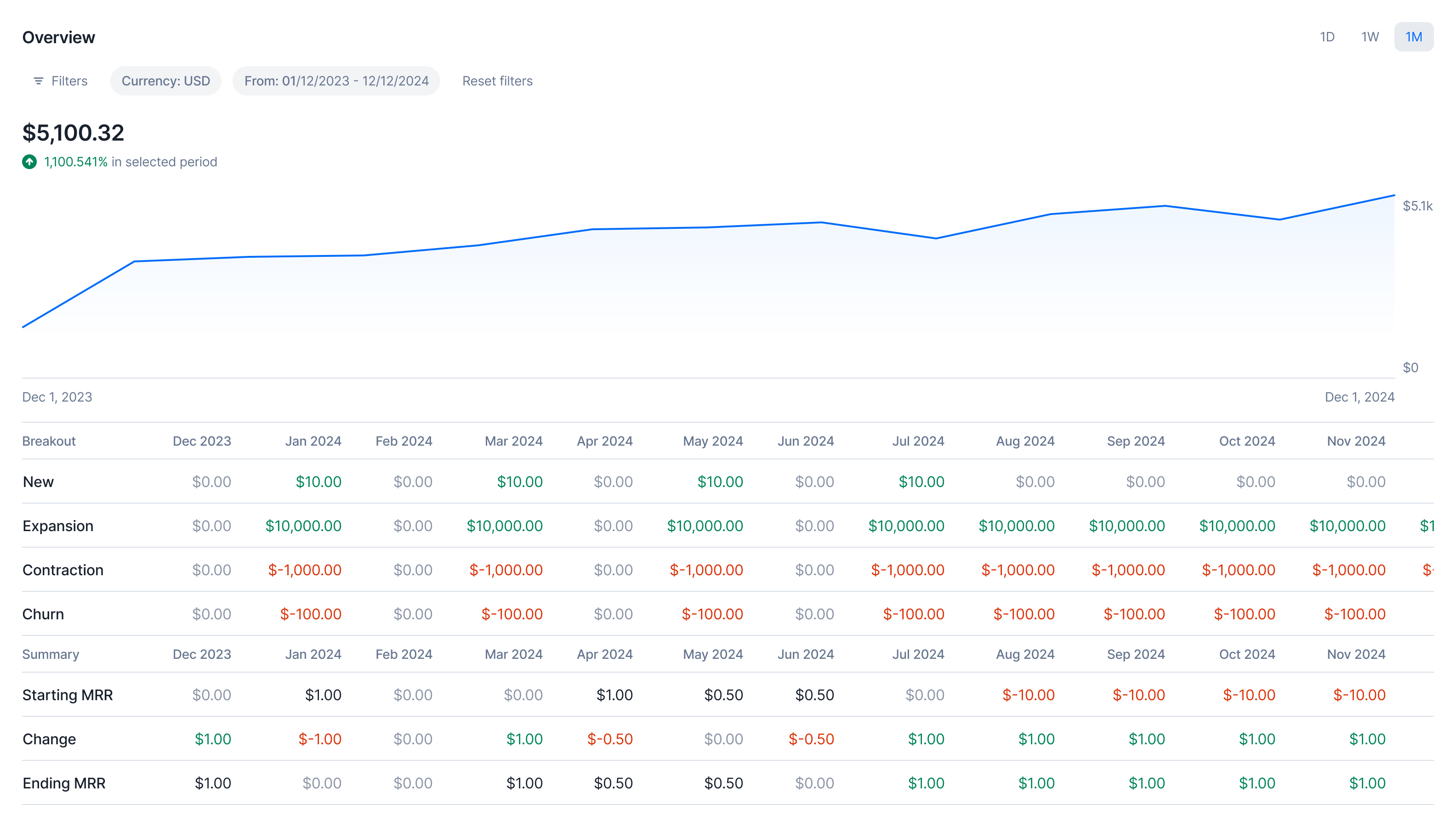 You can analyze your Monthly Recurring Revenue (MRR) data using different time groupings:- Daily: View day-by-day MRR breakdown