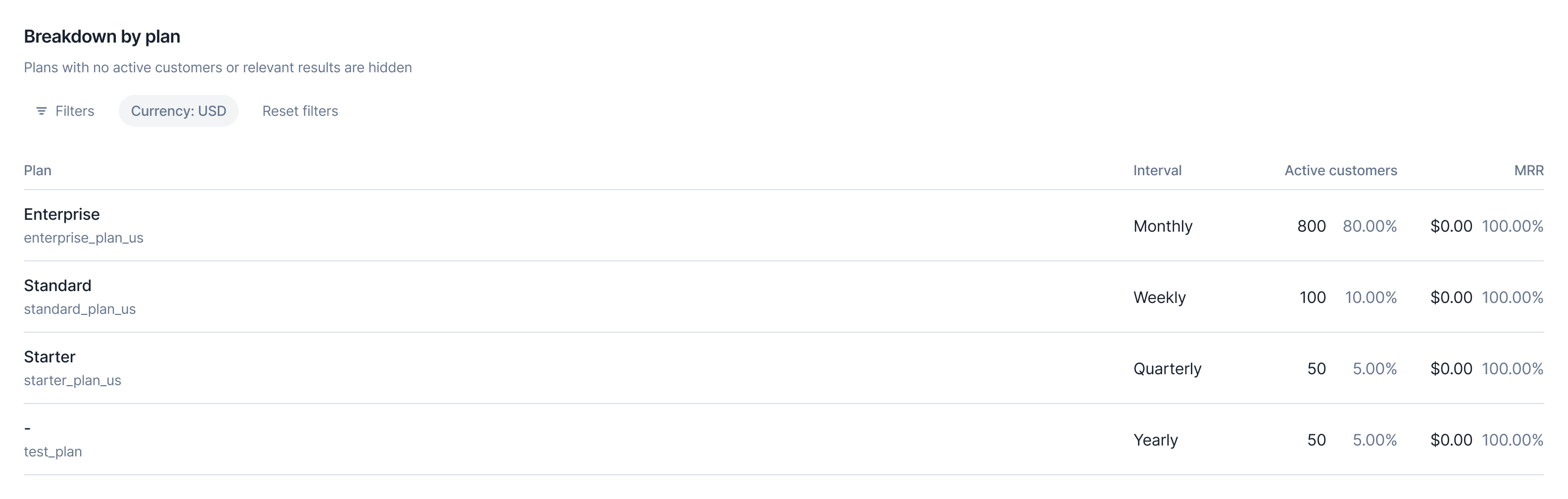The second graph of this page provides a detailed breakdown of your MRR by plans. You can also track the percentage of MRR each plan represents. This view allows you to analyze how different plans contribute to your overall monthly recurring revenue performance.