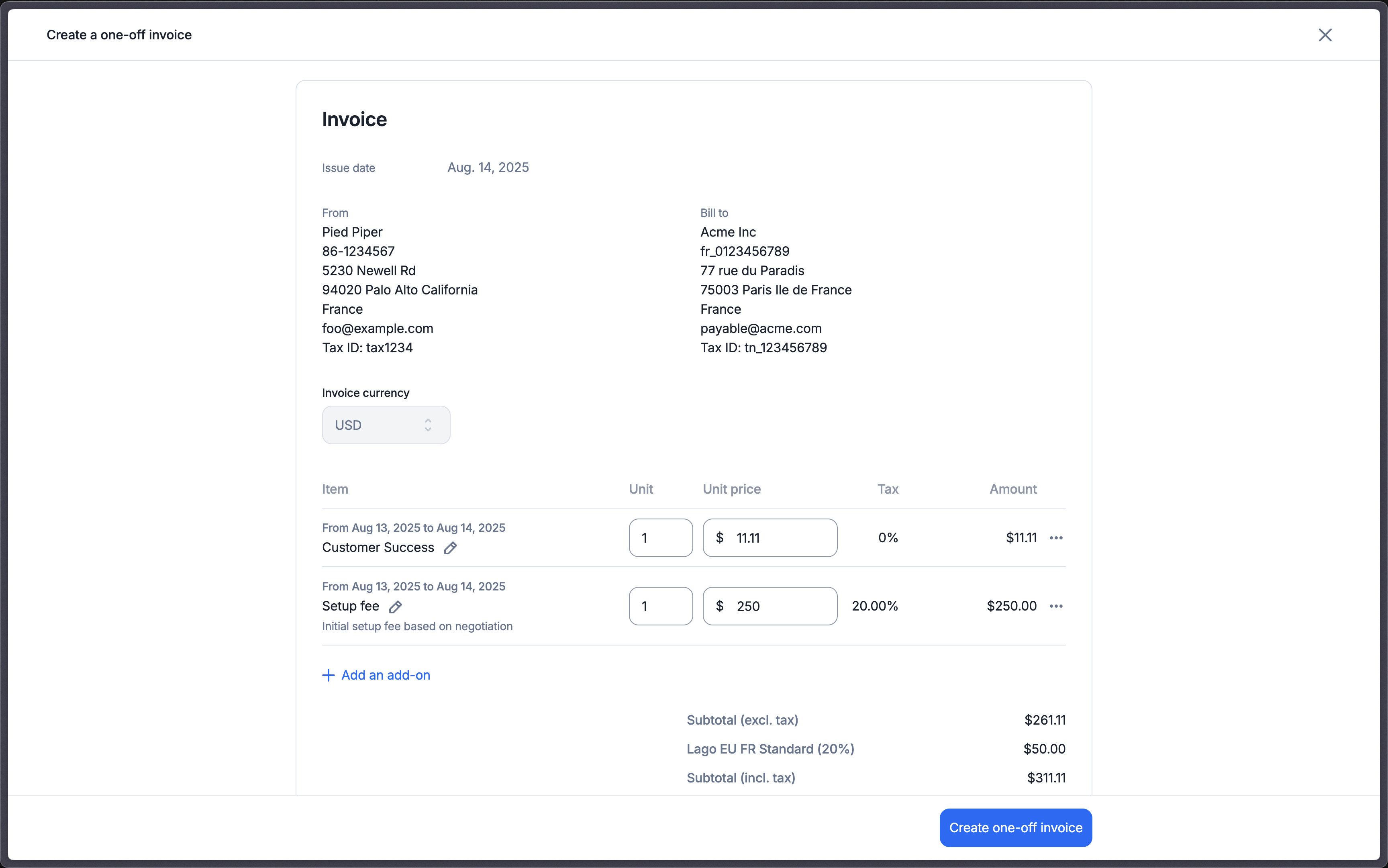 - One-off invoices are subject to taxes, as defined in the customer view.