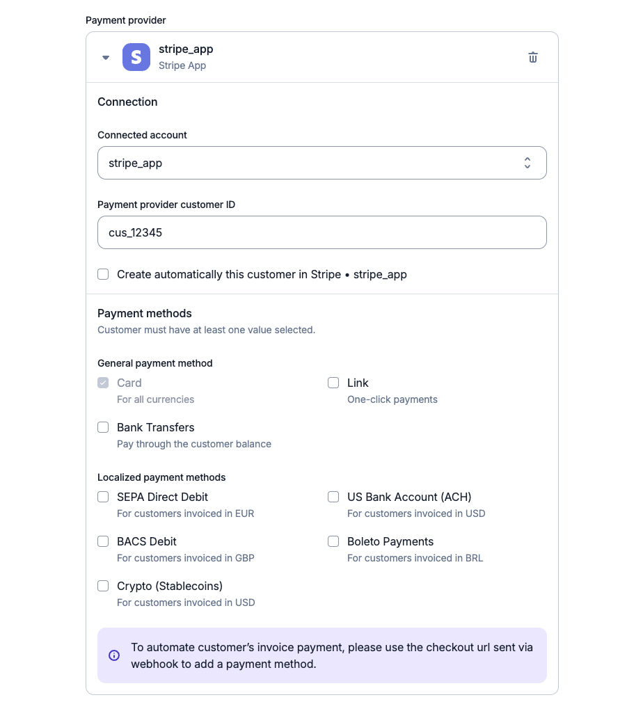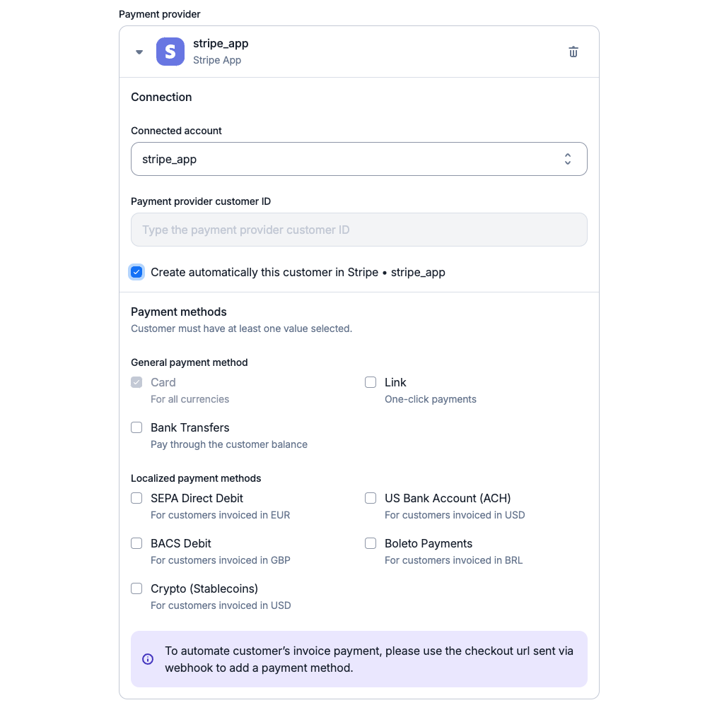 Lago’s Stripe integration includes a universal card payment method that supports various currencies, ideal for global transactions. This method is set as the default to facilitate recurring payments, ensuring Lago can process charges for your customers efficiently.