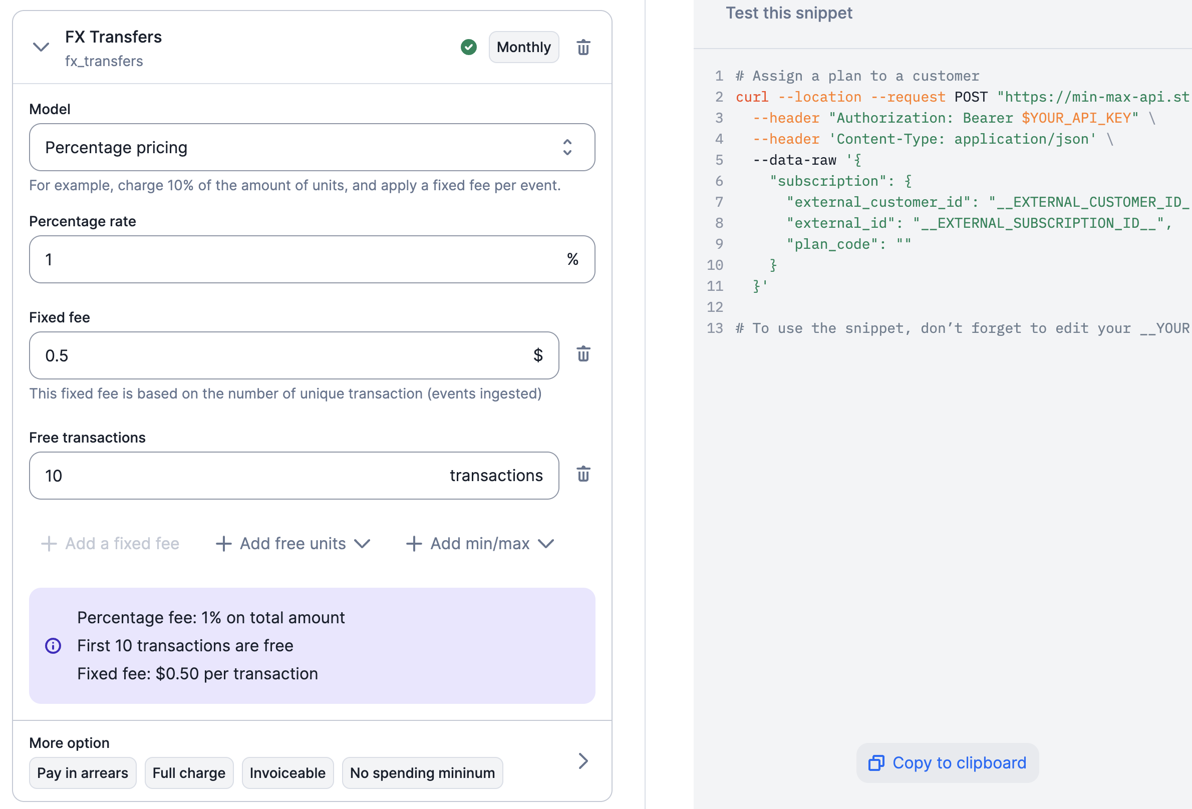 Premium feature ✨: only users with a premium license can define a per-transaction spending minimum and maximum for the percentage pricing model.