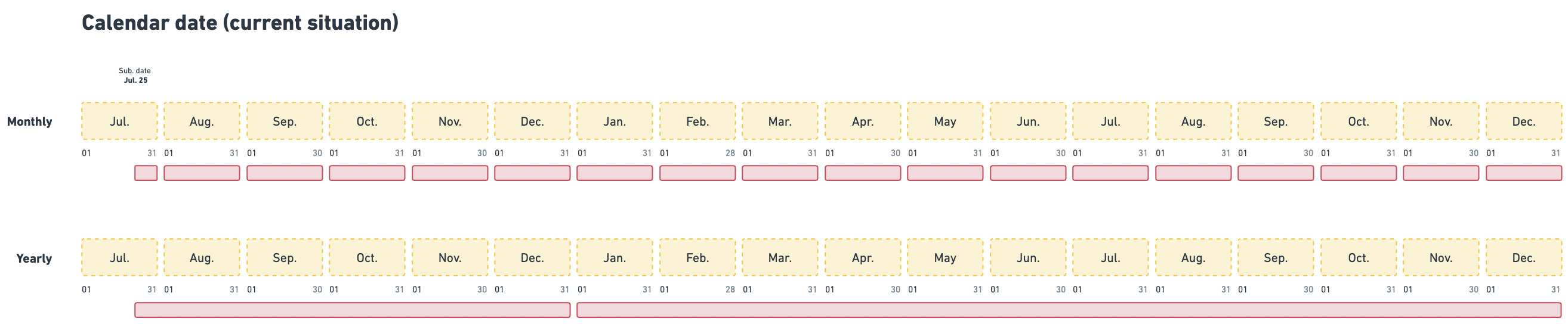 By default, subscriptions are based on calendar periods. Therefore, if you assign a monthly plan to a customer on July 14th: