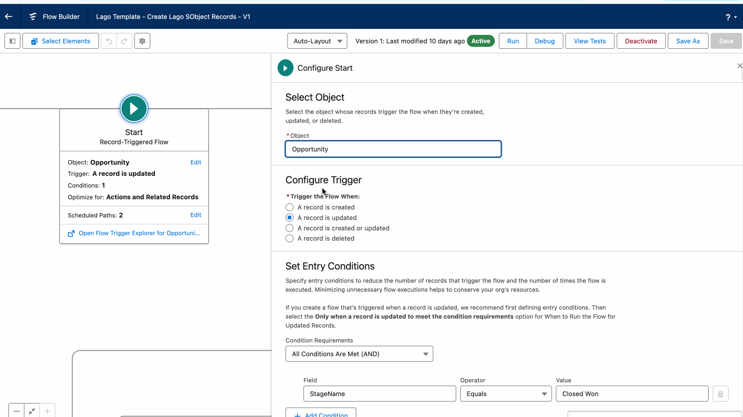 Assigning a plan to a customer, adjusting negotiated prices, and initiating the subscription upon winning an opportunity represents a key action from Salesforce to Lago. This enables sales teams to remain within Salesforce, their primary tool, and activate billing processes directly, without the need to switch platforms. To assign a subscription and set prices in Lago directly from Salesforce, use the provided two flows via following Lago Flow templates.Flow 1: Lago Template - Create Lago SObject Records
