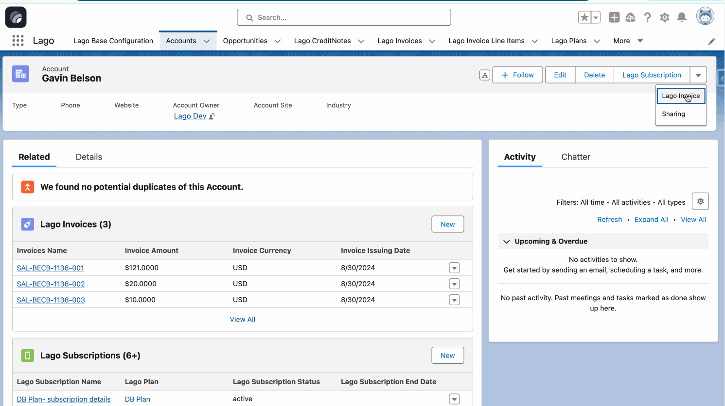 Beyond just syncing data from Lago to Salesforce, you can also initiate actions in Lago directly from Salesforce. You can leverage SalesforceFlows to execute actions in Lago. Lago provides several customizable templates for creating customers from Salesforce Accounts, directly assigning subscriptions to customers from Salesforce, creating one-off invoice from salesforce.
