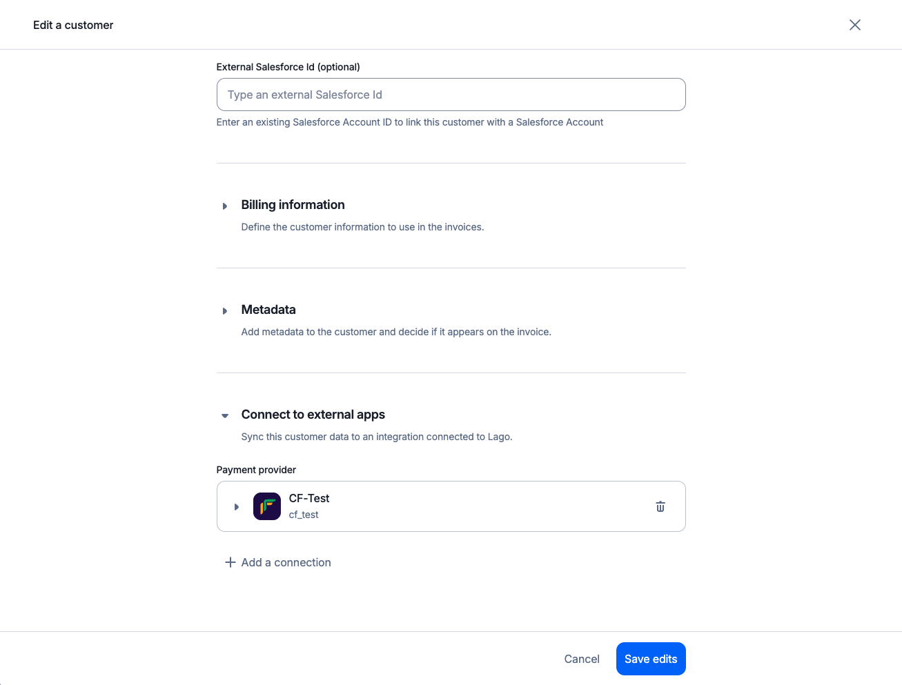 To begin collecting payments for your Lago invoices via Cashfree, you need to link a Lago customer to a Cashfree connection. When creating or editing a customer in Lago, simply select the relevant Cashfree connection under external apps to enable invoice payments.