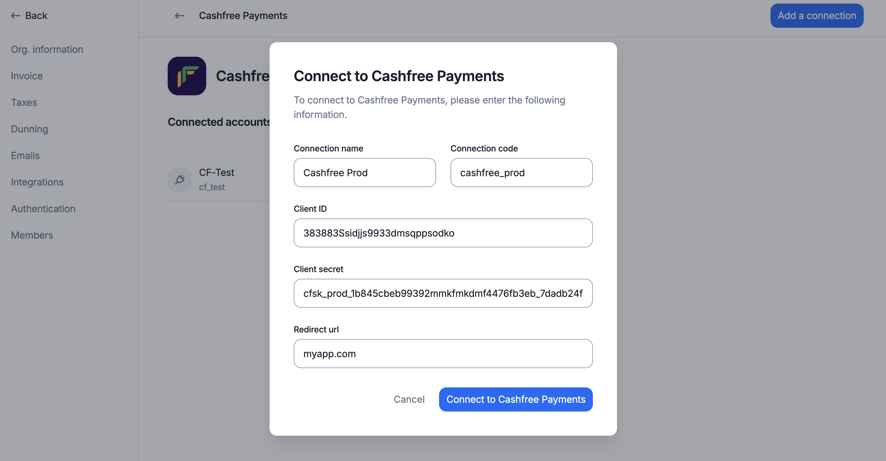 To connect Cashfree to Lago, navigate to your Lago UI, then go to Integrations > Built by community, and add a new Cashfree Payments connection:- Click Add a connection.