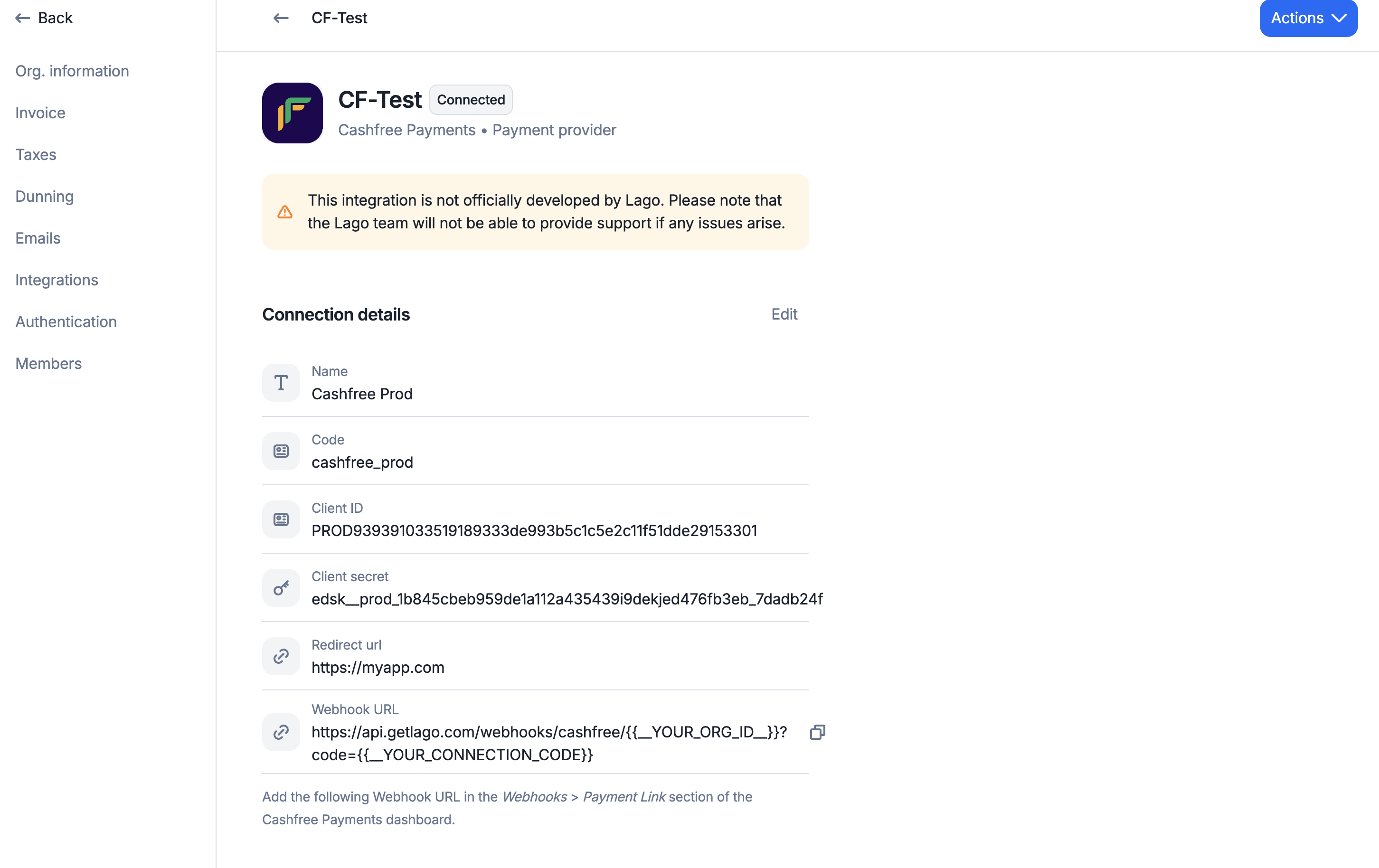 Cashfree is a leading payment platform in India, offering an end-to-end suite of payment and payout products tailored to the country’s needs. Its extensive coverage of payment methods—including credit/debit cards, net banking, UPI, and popular wallets like Paytm, PhonePe, and Amazon Pay—enables businesses to seamlessly collect payments from Indian customers with minimal friction. This integration streamlines the collection of Lago invoices in India by leveraging multiple local payment methods.Connect Cashfree to Lago