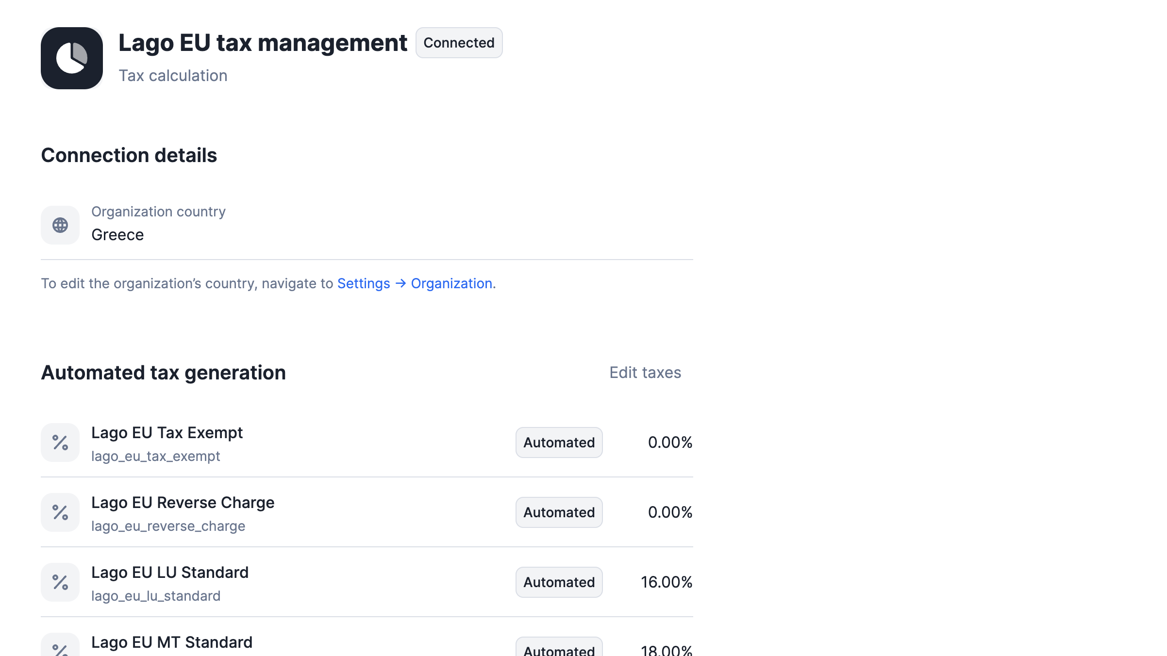 When you connect the Lago EU Tax Management integration, it automatically generates a list of standard European tax rates. These rates, labeled asautomated