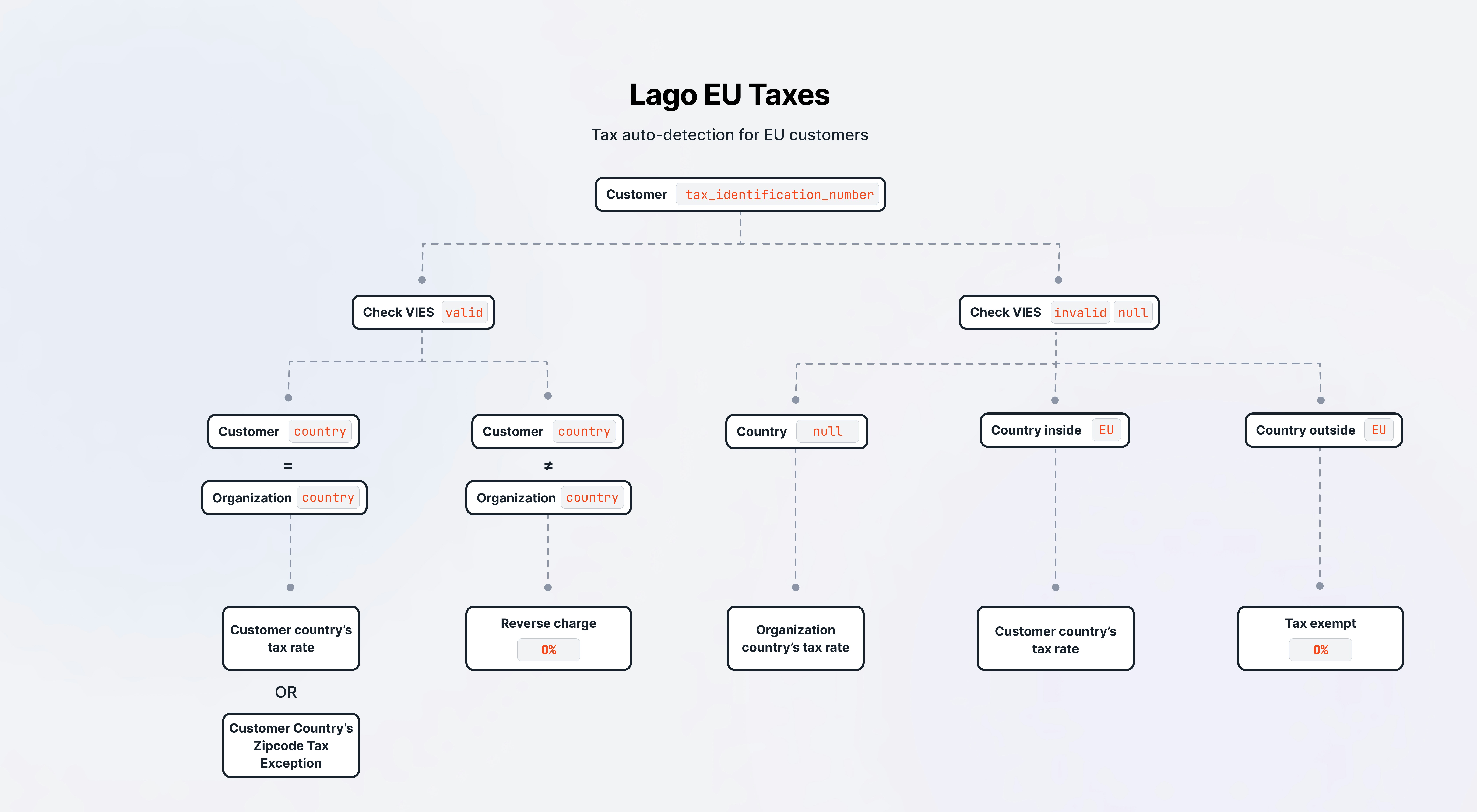 - If the customer’s company is registered in the same country as your organization, but there is a tax exception for a particular zipcode, Lago applies the tax exception of this specific zipcode; or