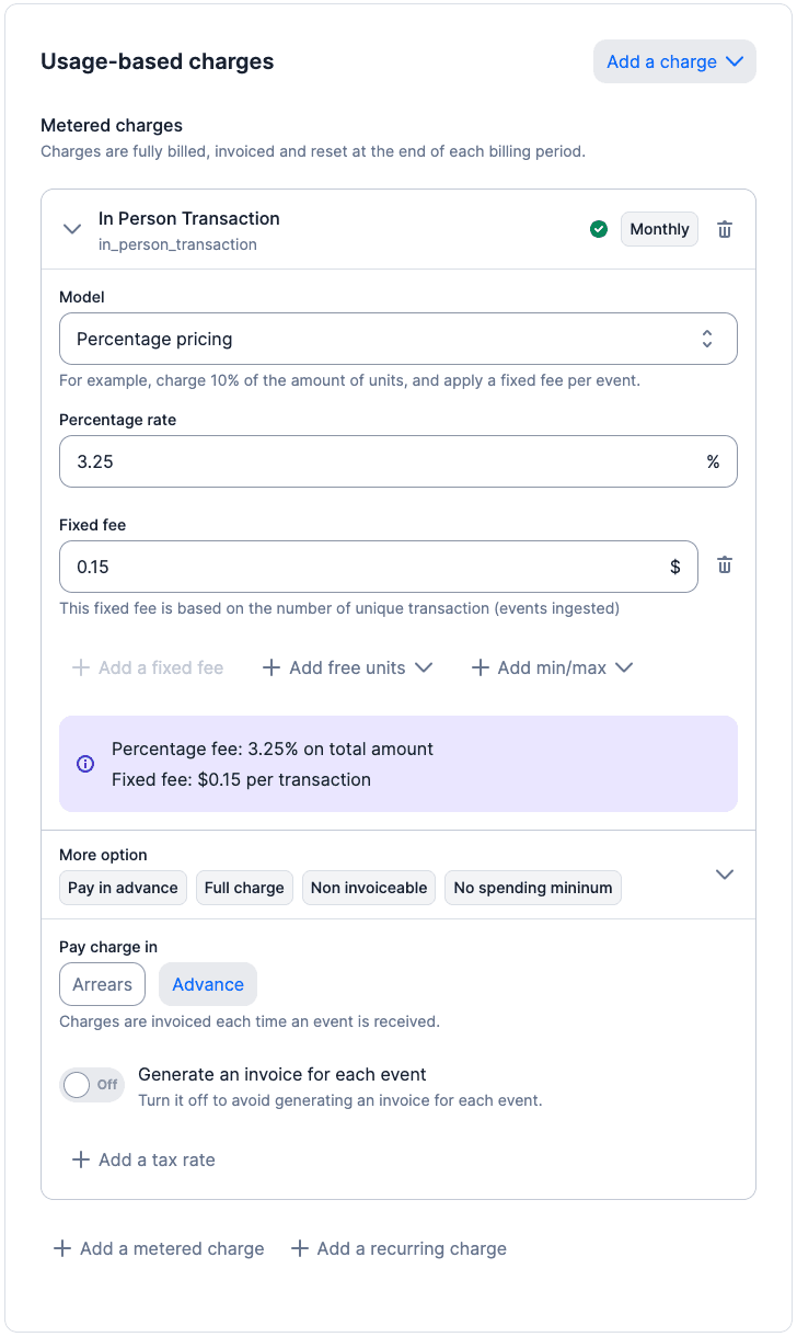 Instant charges are fees that are due as soon as the corresponding ingested events occur (in our previous examples: a transaction or an ATM withdrawal), as opposed to standard charges that are due at the end of the billing period (e.g., typically if you’re making international calls on March 15th and it’s not included in your T-mobile subscription, you’ll only pay the overage for that call by March 30th when you receive the invoice).