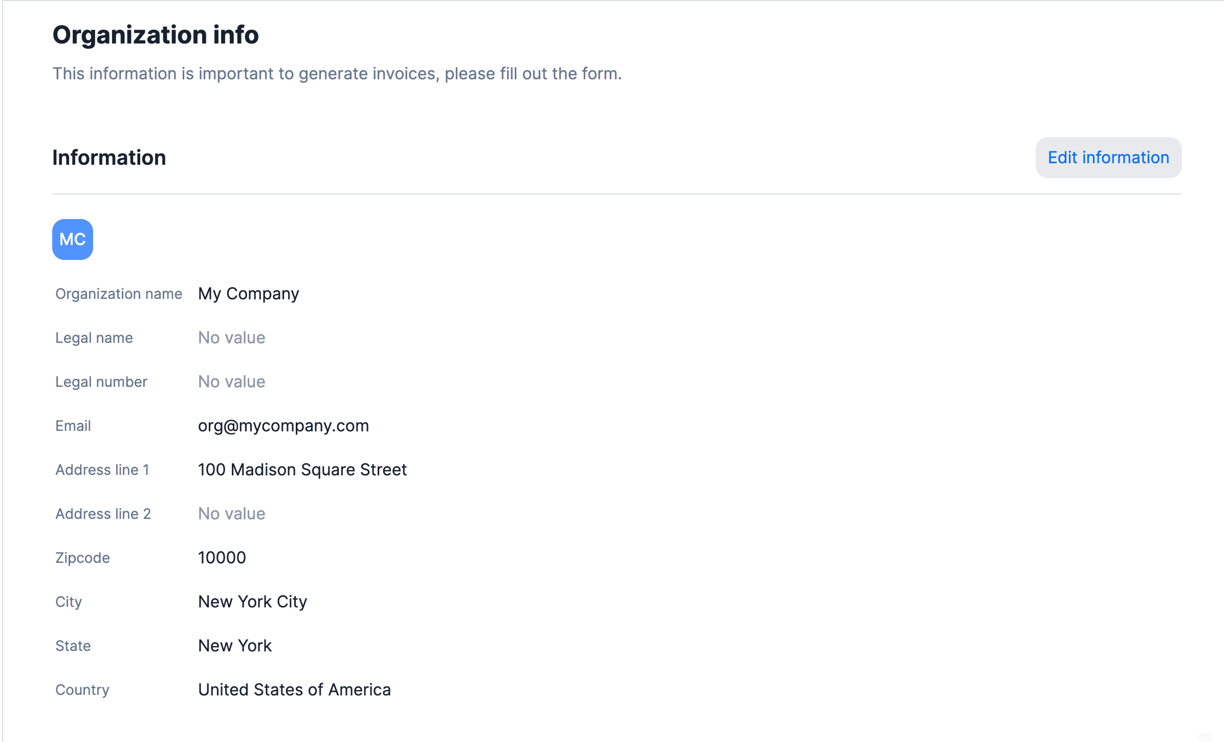 First, our solution allows you to update your organization’s basic information. This information can be modified either via the user interface or API. Imagine that we want to add: