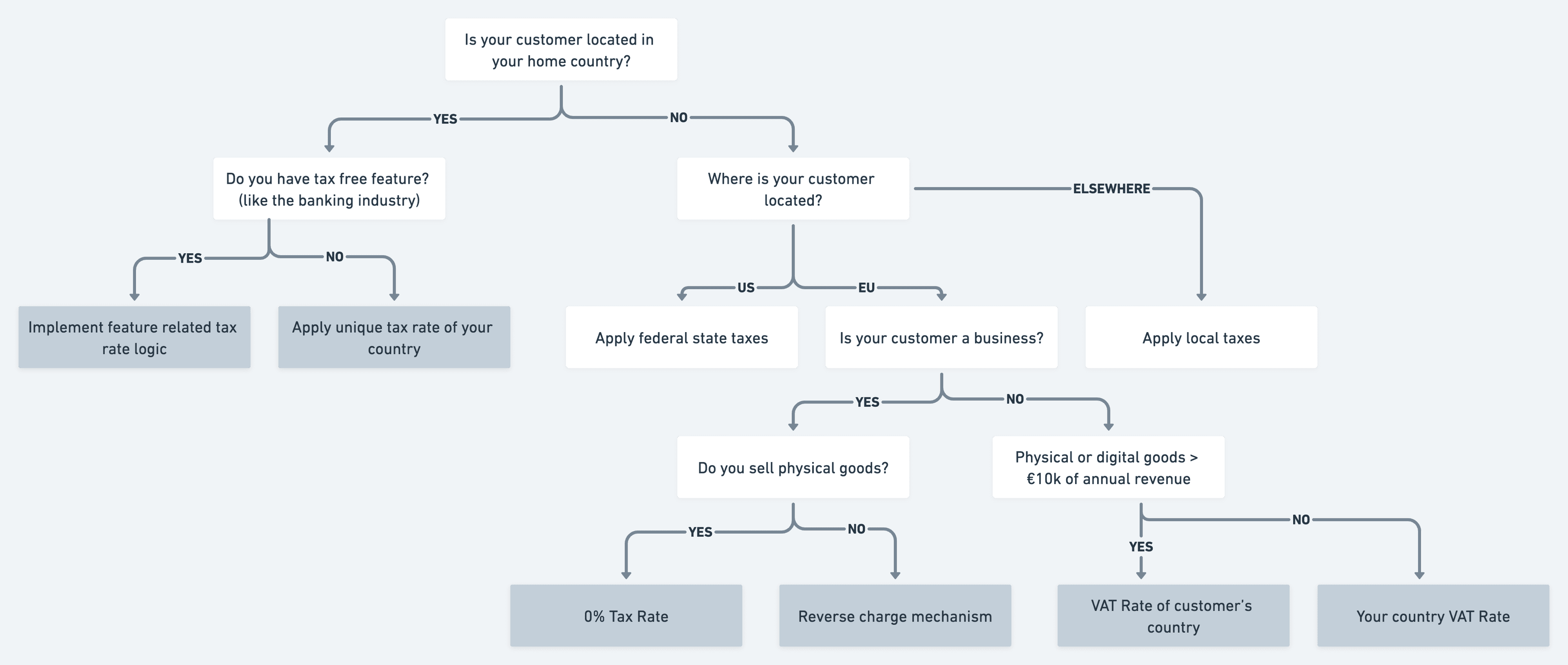 Taxes are challenging and depend on multiple dimensions. Taxes depend on what you are selling, your home country and your customer's home country. In the simplest situations, your tax decision tree should look like this: